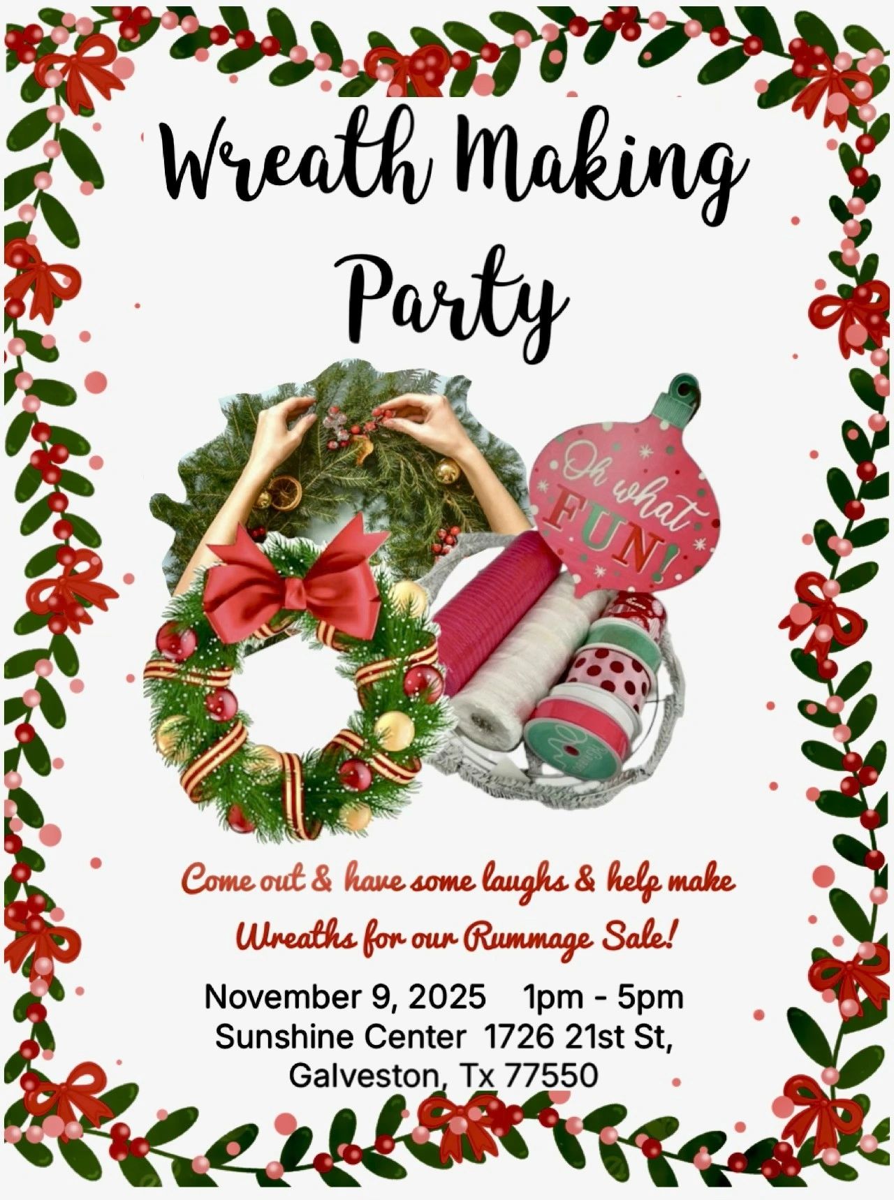 Are you creative...or just enjoy getting in the holiday spirit? Come volunteer your time, talent, or supplies making wreaths for a good cause. All wreaths will be sold at our Holiday Rummage Sale - proceeds benefit Sunshine's program services. Email lauratacquard@yahoo.com for questions.